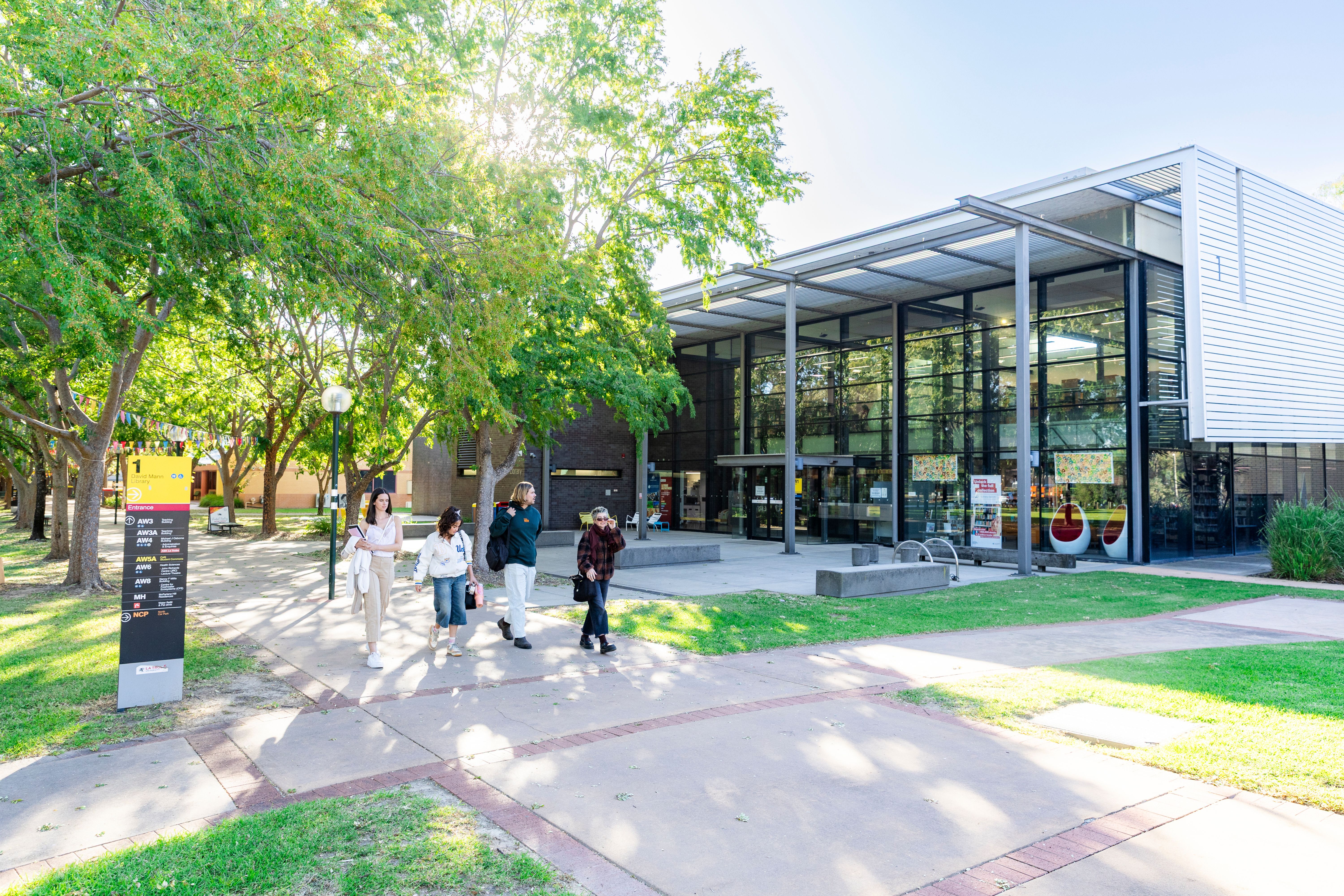 Visuals of La Trobe signage with students relaxing outdoors, La Trobe library entrance.